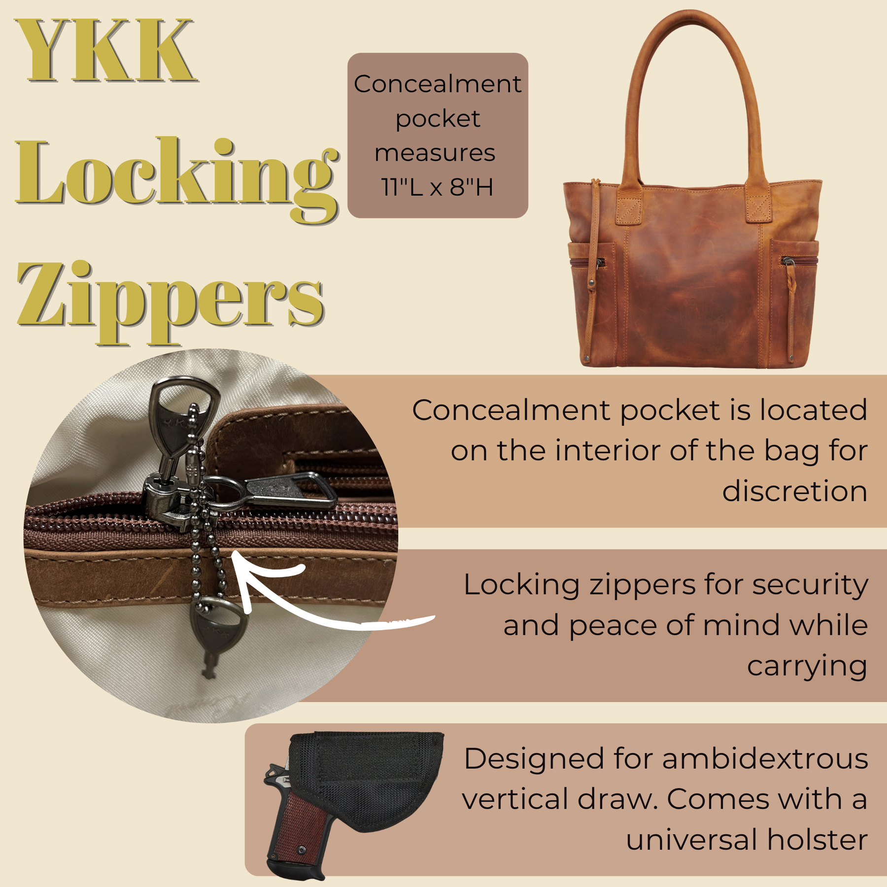Product Summary: The Emerson Leather Satchel by Lady Conceal is constructed with premium full grain leather. This superior leather is unique and has its own natural variations in grain and shading. The roomy interior has plenty of space for your iPad, planner, and more. The interior is divided into two parts by the concealment pocket. The front features two open slip pockets, the back has a zippered pocket, a large open pocket, and a leather key strap. It is secured with a zippered closure. On each end of the bag are open slip pockets and zippered pockets for your cell phone or other necessities. The adjustable crossbody strap easily clips on and off and measure 32”- 57” by 1” (drop 16” - 29”). The sturdy handles have 9” drop. It features gunmetal-tone hardware.
