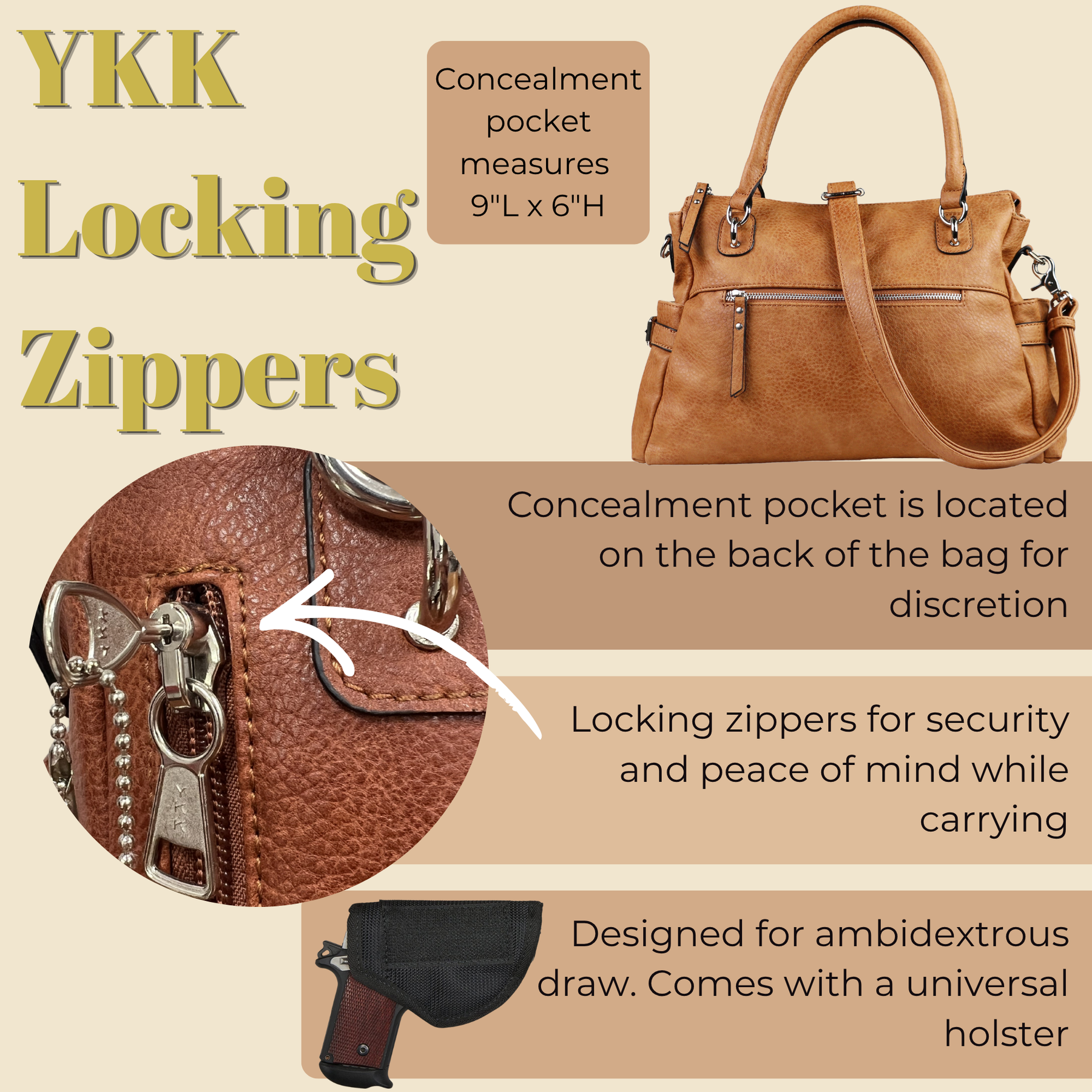 I love this purse! It is large enough to hold what I need, and I like the fact it has so many pockets -- even two on the outside which I use for sunglasses and a small water bottle! The inside zippered pockets are handy, too -- no worries about things falling out if something else is pulled out! The outside zippered pocket is sweet (handy), too. The locking zippered concealed carry area is perfect for right/left hand access -- perfect! Five stars for this purse!