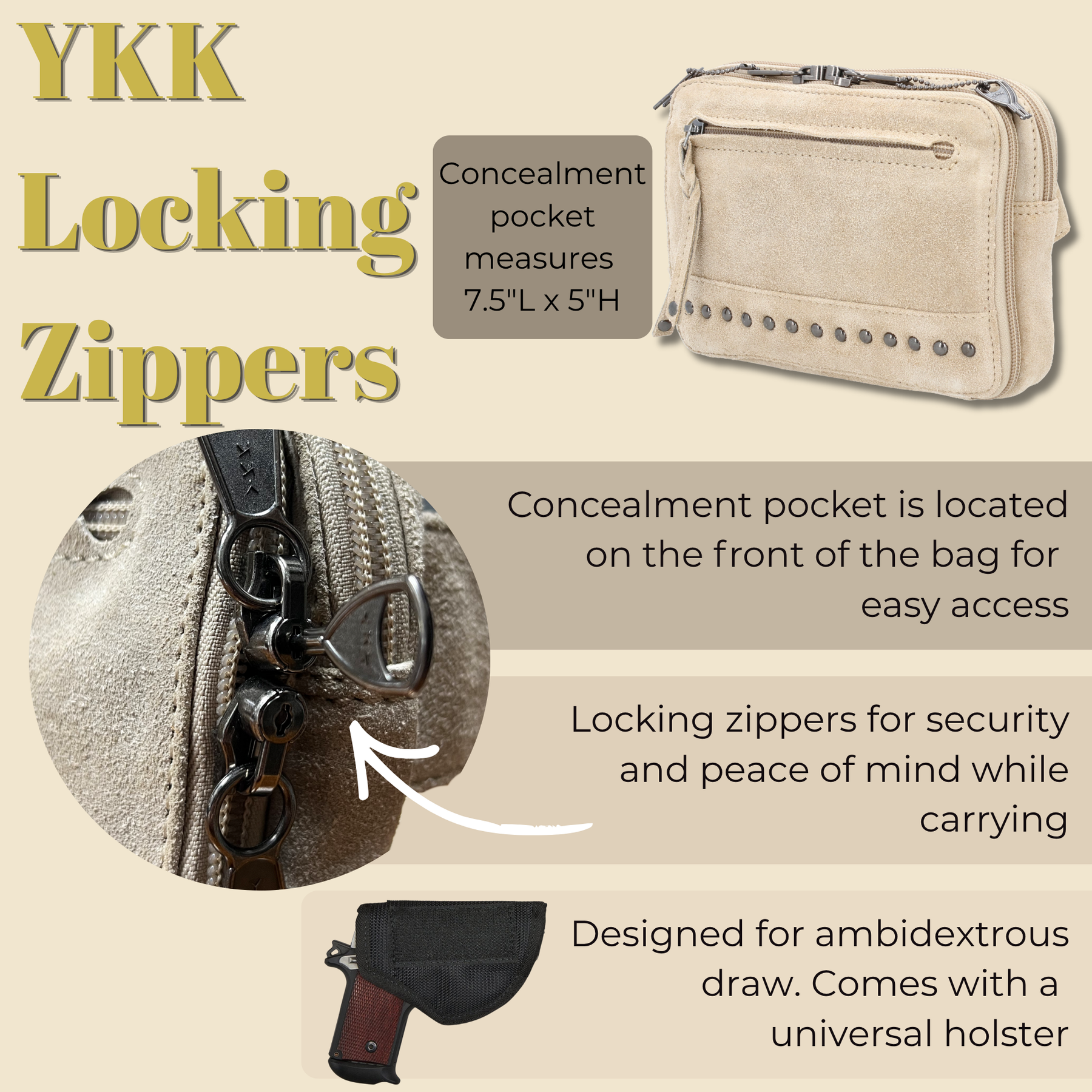 YKK Locking Concealment: The easy-access concealed carry compartment is designed for right or left-handed use, zips open on 3 sides, and measures approximately 7.5" L x 5" H. It is secured with YKK locking zippers and includes 4 keys. This pocket is constructed of durable nylon and can accommodate up to a small-frame handgun. A universal medium holster is included which features Velcro hooks for a secure fit in the concealment pocket.