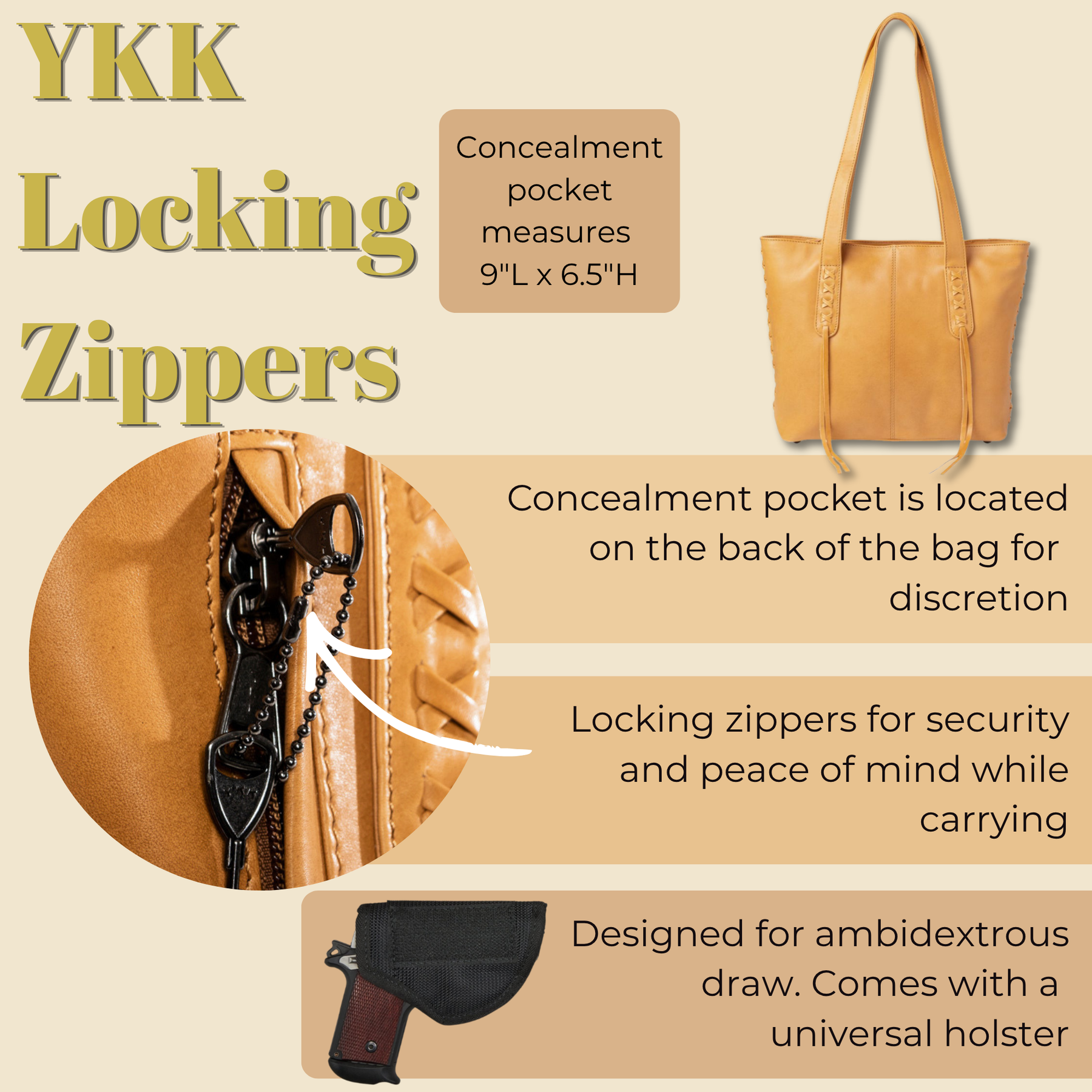 The ambidextrous concealment compartment, located on the back, is designed for right or left-handed users. It is secured with YKK locking zippers and includes 4 keys. Discreet leather flaps conceal the locking zippers for secrecy. This compartment measures 9” L x 6.5” H. It is constructed of wear-resistant nylon and can accommodate a large frame handgun. This bag comes with a universal holster with Velcro for a secure fit in the concealment pocket.