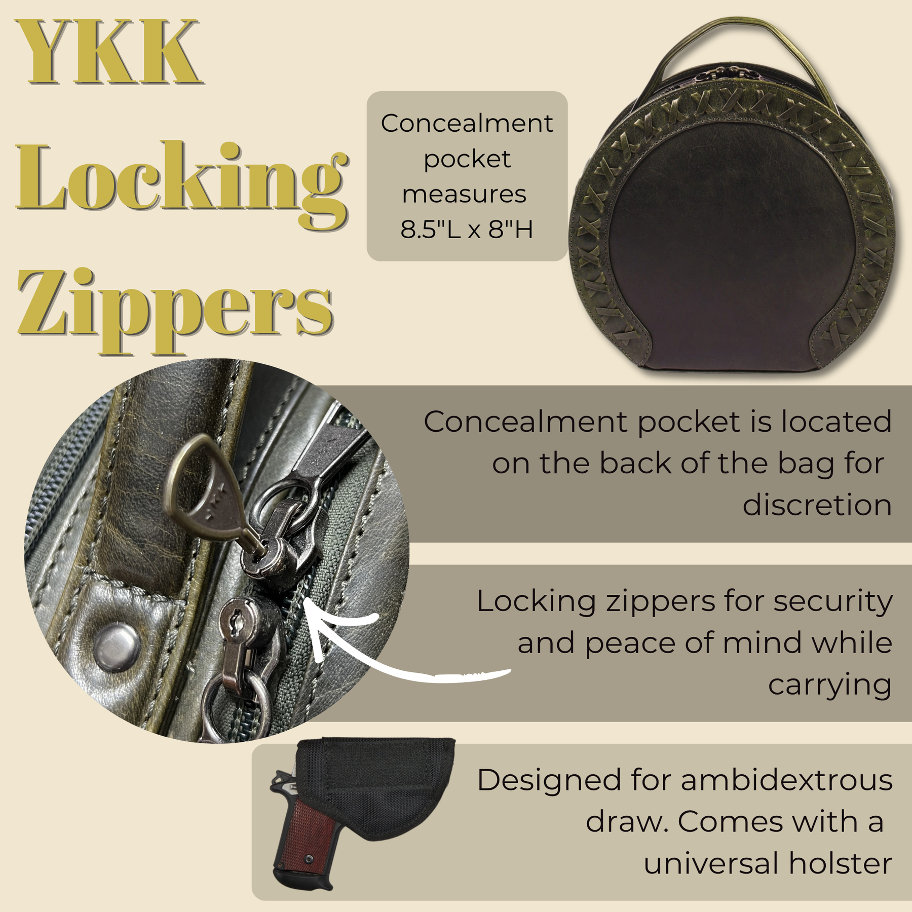 The concealed carry compartment is located on the back and is designed for right or left-handed use. This compartment zips open and measures approximately 8.5" L x 8" H. It is secured with YKK locking zippers and includes 4 keys. This pocket is constructed of scratch-resistant nylon and can accommodate up to a large-frame handgun. A universal holster is included which features Velcro for a secure fit in the concealment pocket.