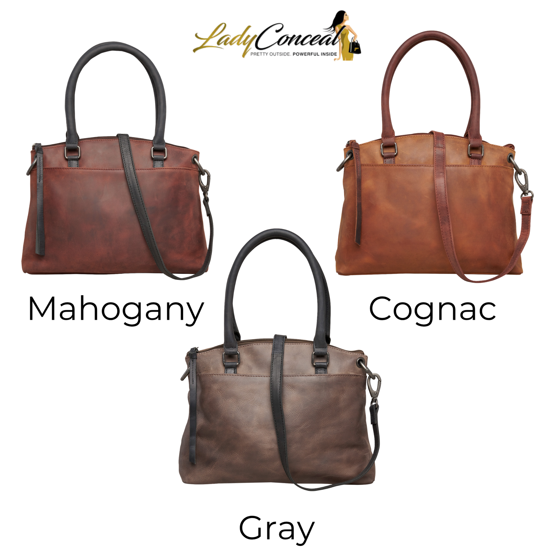 The Whitley Two-Tone Leather Satchel by Lady Conceal is constructed with premium full-grain leather. This superior leather is unique and has its own natural variations in grain and shading. You will fall in love with the full-size slip pockets on the front and back. An additional zippered pocket for your cell phone is located on the back. The spacious interior is divided into two parts by a full-length zippered pocket. The front compartment features two open slip pockets. The back compartment has a zippered pocket, a large open pocket and a leather key strap. The adjustable crossbody strap easily clips on and off and measure 32”- 57” by .75” (drop 14” - 27”). The double handles have a 6” drop. It features unique gun metal-tone hardware and holds its shape when resting.