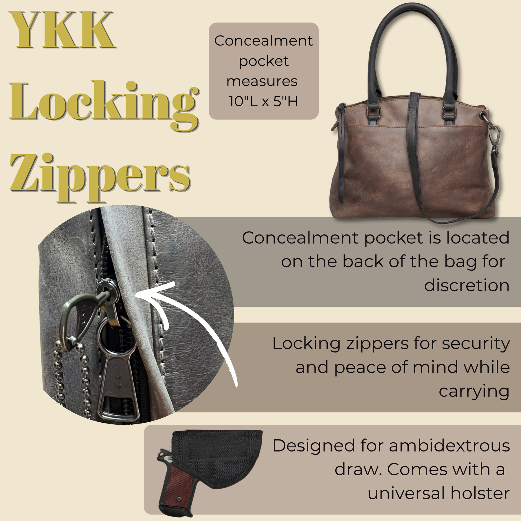 The ambidextrous concealment compartment, located on the back, is designed for right or left-handed users. It is secured with YKK locking zippers and includes 4 keys. Discreet leather flaps conceal the locking zippers for secrecy. This compartment measures 10” L x 5” H. It is constructed of wear-resistant nylon and can accommodate a small-frame handgun. This bag comes with a universal holster with Velcro for a secure fit in the concealment pocket.